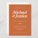 Teil einer Hochzeitssuite. Eine minimalistisch-orangefarbene Hochzeitseinladung mit einem typografischen Design und einem im Jugendstil inspirierten Serif-Schriftart, der für Herbst- und Herbstbräute perfekt geeignet ist. Auf der Rückseite der Einladung befindet sich ein optionales einfaches Monogramm-Design. Einfach personalisieren, indem Sie jede Information ersetzen. Bestelle noch heute.
