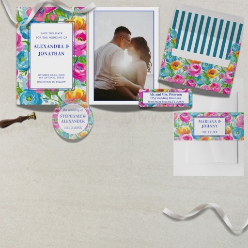 Bright strokes of electric pink, modern cobalt blue, sunshine yellow, teal, coral, and fresh green create a lush, energetic botanical frame that instantly sets the tone for a bold, elevated celebration. The center panel remains crisp and clean, allowing your text to stand out within a beautifully structured layout. Paired with a classic serif font in vibrant cobalt blue, your names and wedding details appear polished, elegant, and easy to read—striking the ideal balance between bold artistry and timeless sophistication.