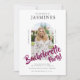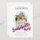 Announce your upcoming bachelorette bash with this elegant photo invitation! This design features a vibrant purple script announcing 'Bachelorette Party!' overlaying a cherished photograph of the guest of honor. The accompanying text details all the essential information for the celebration, ensuring your guests have everything they need. It's a sophisticated and chic way to invite your favorite ladies to a night of fun and celebration. Perfect for a modern bride who loves a pop of color and personalized flair.