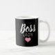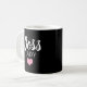 Kaufst du ein Bossgeschenk für eine Frau? Karo aus dieser niedlichen modernen Tasse. Es ist auf beiden Seiten mit "Boss Lady" in trendigem weißen Pinselskript und minimalem Schriftart und einem rosa Herz entworfen. Anpassen des schwarzen Hintergrunds an jede Farbe.