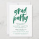 Einladende Gäste, um den Abitur mit unserer modernen Abschlussfeier lädt ein! Die trendy Graduierungsparty Einladungen zeigen "grad Party" in einem grün bemalten Pinsel Schriftart. Personalisieren Sie die kreative Graduiertenparty lädt ein, indem Sie den Namen des Absolventen, den Namen der Schule, das Abschluss Jahr und die Abschlussfeier Details hinzufügen. Das Ergebnis ist ein roter und weißer Pinselstrich.