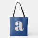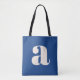 Eine kühne und zeitgenössische Tasche mit tiefblauem Hintergrund mit einem auffallenden weißen Kleinbuchstaben in moderner Typografie. Dieses auffällige Design ist perfekt für den täglichen Gebrauch, Einkäufe, Arbeiten oder als Statement-Accessoire geeignet und verbindet Minimalismus mit einer Retro-inspirierten Ästhetik. Ideal für Typografen und für alle, die stilvolle, einzigartige Designs schätzen.