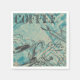 Modern sketched design of a steaming coffee cup next to a coffee grinder with an abstract blue background.