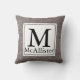 Tief kaffeebraun und weiß Akzente Herringbone gemusterter Hintergrund. Die Mitte ist mit einem weißen quadratischen Rahmen mit schwarzem Monogramm-Buchstaben und einem vollständigen Familiennamen versehen. Vorder- und Rückseite sind gleich. Auch auf lumbalstigen Kissen erhältlich.