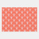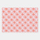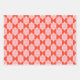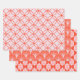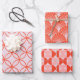 The wrapping paper set features a modern, playful geometric patterns in a vibrant palette of coral, orange, and light pink: (circles, scallops or fan, half moons) that can be mixed and matched.