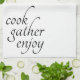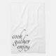 Modernes, weißes Küchentuch mit den Worten "Koch sammeln genießen" in schwarzer Schrift.