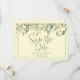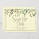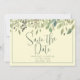 Moderne Save the Date-Meldungen: Aquarellfarbene Eukalyptus-Blätter, die auf cremefarbenem Hintergrund angeordnet sind, mit grünen, anpassbaren Textblöcken in modernen Schriftart
