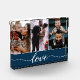 Personalisieren Sie diesen Foto-Block mit 3 Fotos. Wählen Sie die Fotos der Familie, die Kinder, die Eltern, die Ehefrau, den Ehemann, die Fotos, die Haustiere (Hunde, Katzen, Fisch usw.). Blau Bar unten mit einem modernen Skripttyp "Liebe".