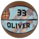 Moderner Basketball für den benutzerdefinierten Spielernamen und -nummer. Aquarellfarbene Hintergrundtextur in Blau- und Grautönen. Personalisieren Sie es mit Ihrer Spielernummer und Ihrem Spielernamen. Das Design hat einen Basketball zeichnend. Ein großartiger personalisierter Basketball-Sake, um sich an den Lieblingssport zu erinnern.