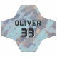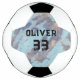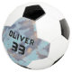 Moderner, benutzerdefinierter Spielername und Nummer halten Fußball-Ball. Aquarellfarbene Hintergrundtextur in Blau- und Grautönen. Personalisieren Sie es mit Ihrer Spielernummer und Ihrem Spielernamen. Ein großartiger personalisierter Fußball-Sake, um sich an den Lieblingssport zu erinnern.