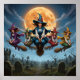 Colorful ai image of witches flying on their brooms over a grave yard, nice Halloween theme image.