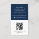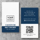 Weiß und dunkelblau oder kundenspezifisch, modernes, berufliches Visitenkartendesign mit Vorlagenfeldern für Name, Firmenname/Firmentitel, Logo (Foto oder andere Grafik), QR-Code und Kontaktinformationen einschließlich Social Media Icons. Ändern Sie die Hintergrundfarbe, verschieben und verändern Sie Elemente mit dem Anpassungstool.