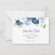 Elegante florale Aquarellfarben staubige blaue, weiße und marineblümte Bouquet Hochzeit speichern die Dattelkarte. Die Karte verfügt über ein Skript "Save the Date", das in einen Schriftart Ihrer Wahl geändert werden kann, der hier verfügbar ist, wenn Sie auf "Personalisieren" klicken.
