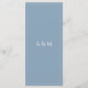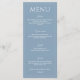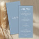 Modern and simple wedding menu in dusty blue. Clean and easy-to-read design that matches a minimalist modern wedding theme. Includes course description - starter, main course, desert and drinks information which is easy to edit and personalize.