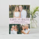Mit dieser stilvollen, modernen Foto Save the Date-Karte verkünden Sie Ihr Hochzeitstag. Das Design enthält drei Ihrer Lieblings-Verlobung-Fotos mit "Save the Date" in schwarzen Serifen und Skript-Schriftart vor einem lila Hintergrund (oder Farbe Ihrer Wahl). Personalisieren Sie die minimalistische speichern Sie die Datum Ankündigungen durch Hinzufügen Ihrer Namen, Datum und Hochzeitsort. Die Karte kehrt zu einem lila Hintergrund mit solidem Licht zurück. Die Ankündigung Datum freihalten ist perfekt für jedes Hochzeitsthema.