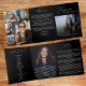 Sophisticated, modern trifold funeral program template with a striking black background and elegant white script typography, designed to create a timeless and dignified memorial keepsake. This layout includes space for an obituary, thank you message, order of service, memorial poem, and seven photo placements, allowing families to beautifully showcase cherished images alongside meaningful tributes. The high contrast black and white design conveys a sense of grace and reverence, making it a heartfelt choice for honoring a loved one’s memory and providing guests with a lasting remembrance of a life well lived.