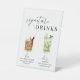 This modern, elegant wedding pedestal sign for his and hers signature drinks features a minimalist design, classic serif font, elegant script font, and watercolor drinks. Edit the names and ingredients of each drink for your wedding or event.