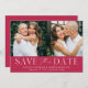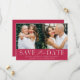 Mit dieser stilvollen, modernen Foto Save the Date-Karte verkünden Sie Ihr Hochzeitstag. Das Design enthält zwei Ihrer Lieblings-Verlobung-Fotos mit "Save the Date" in weißen Serifen und Skript-Schriftart vor einem magentafarbenen Hintergrund (oder einer beliebigen Farbe). Personalisieren Sie die minimalistische speichern Sie die Datum Ankündigungen durch Hinzufügen Ihrer Namen, Datum und Hochzeitsort. Die Karte kehrt auf einen soliden magentafarbenen Hintergrund zurück. Die Ankündigung Datum freihalten ist perfekt für jedes Hochzeitsthema.