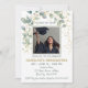 Modern eucalyptus greenery graduation party invitation with elegant gold accents, designed to celebrate a graduate in a timeless and feminine style. Personalize with the graduate’s name, class year, and event details for a polished and memorable announcement.