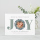 Moderne Eukalyptus Foto Typografie Weihnachtskarte - JOY ist in der modernen fett formatierten Typografie in Salbei grün mit Eukalyptus und Heiligenbeerkranz rund um Ihr Lieblingsjargon enthalten. Die redaktionelle Begrüßung lautet "Einen Urlaub voller Freude wünschen". Alle unsere Liebe, Ihr Familienname und Familienmitglieder. Alle Texte können bearbeitet werden. Der Hintergrund kann auch in eine beliebige Farbe geändert werden. Entworfen von Beverly Bainbridge Magnolia & Thistle