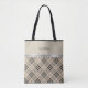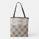 Upgrade your daily carryall with this sophisticated Beige and Charcoal Plaid Tote Bag. Perfectly blending the "Modern Farmhouse" aesthetic with "Quiet Luxury," this tote features a crisp horizontal split design. The top section, in a clean minimalist beige, showcases your personalized name in a timeless serif font, while the bottom features a classic diagonal plaid pattern in tan and deep charcoal tones. A sleek black line at the top provides a designer finish that perfectly anchors the sturdy black handles. Whether you're heading to the farmer's market, the library, or the office, this durable and stylish bag is designed for versatility. It makes a thoughtful, high-end gift for birthdays, teachers, or bridesmaids. Personalize it today to add a touch of understated elegance to your wardrobe.
