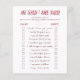 Test how well guests know the couple with this fun He Said She Said Bridal Shower Game. Guests read each statement and guess whether the bride or groom said it. It’s a simple and entertaining activity that gets everyone laughing and involved. Perfect for bridal showers, bachelorette parties or wedding celebrations. Personalize the design to match your event theme and create a memorable moment for the bride and guests.