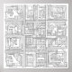 A clean, square technical interpretation of the concept, the Digital Block Pattern. Here, the Graffiti Glyphs appear pixelated or digitized within the Grid, resembling a complex computer or video game texture. This line art piece emphasizes the geometric and technical structure, perfect for a modern coloring experience.