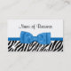 Eine moderne, gürtelförmige, schwarz-weiße Visitenkarte mit einem kühnen Zebradruck und einem hübschen, hellblauen Band, das in einem niedlichen Bogen befestigt ist. Personalisieren Sie dieses weibliche Design, indem Sie den Namen Ihrer Firma hinzufügen. Flachbild, nicht eigentlicher Bogen.