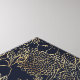 Elegante goldfarbene, zarte Blume aus dem Frühjahrsgarten, handgezeichnet marineblau gestaltet, mit einer Sammlung von Imitaten aus metallischem Gold, Gänsegelb, goldgelben Blume Doodles, goldgelben Blattformen, Grünlinien, auf dunkelblauem, marineblaublauem Hintergrund. Einzigartige minimalistische botanische Natur Blütenzeilenkunst.