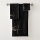 Ein elegantes Set mit Goldplakat-Schriftzeichen und edlem Handtuchhalter für Ihre Badezimmerdekoration. Gold monogramm weiße Skript, auf schwarz.