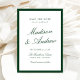 Announce your wedding with this dark green photo save the date card, designed with a rich, classic border and an elegant typographic layout. The couple’s names are featured in flowing calligraphy script, paired with refined serif lettering for the date, venue, and location, creating a formal yet romantic presentation. The back displays your engagement photo framed in coordinating green for a cohesive, editorial look. Perfect for estate weddings, garden venues, black tie celebrations, and traditional ceremonies, this personalized green save the date coordinates beautifully with classic wedding invitation suites and offers a sophisticated way to share your wedding date.