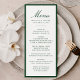 Featuring graceful dark green script at the top, this wedding menu combines traditional calligraphy with crisp serif lettering for the couple’s names and menu details. The deep green frame brings a sense of richness and understated luxury, perfect for estate, garden, and classic weddings. With its balanced composition and strong border, this menu card offers a polished presentation for showcasing your reception courses in a cohesive and elevated way.