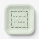 Add a stylish touch to your wedding reception, rehearsal dinner, engagement party, or wedding shower with these Modern Green Wavy Frame paper plates. The retro wedding paper plates display the couple's names in bold green lettering surrounded by a green wavy border contrasting with a light green background. The trendy wedding paper plates were designed to coordinate with our Modern Wavy Frame wedding collection.