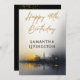 A Modern Happy 40th Birthday Party Invitation designed with a city scape in black and gold and the text: Happy 40th Birthday with the NAME. The reverse text includes: Please Join Us As We Celebrate, The Date and Time, The Location Name and City, and Your RSVP Details. To personalize, simply insert your event text into our easy template, replacing the sample. This invitation is available in both Print and Download.