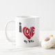 Make a heartfelt statement with this striking mug that reads "I Love My Wife." The design features a vibrant red heart with the word "Love" artistically incorporated, paired with bold black typography. This graphic design is a perfect way to convey your enduring love and commitment to your spouse and/or loved ones. Ideal for anniversaries, Valentine's Day, or just as a daily declaration of affection, this mug adds a touch of romance to your morning coffee or evening tea ritual. Show your loved one how much they mean to you with this beautiful and meaningful piece.
