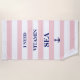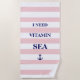 Dieses wunderschöne Strandtuch ist marineblau mit einer Ankerillustrierung auf einem rosa und weiß gestreiften Hintergrund.