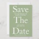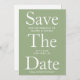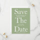 Trendy und kühne Kalligraphie Save the Date in Salbei grün. Personalisieren Sie es mit den Namen der zukünftigen Braut und des Bräutigams, Datum, Position und fügen Sie eine beliebige Farbe auf die Rückseite, indem Sie auf die Schaltfläche klicken, um das Design zu bearbeiten.