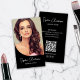 Erstellen Sie eine berufliche und moderne Visitenkarte mit einem benutzerdefinierten Foto auf der Vorderseite und personalisierten Details, sowie einen scannbaren QR-Code auf der Rückseite, um das Netzwerk zu erleichtern, und editierbare Social Media Icons. Passen Sie Schriftart, Farben, Hintergrund und Layout einfach an Ihren Stil an. Ideal für Makeup-Künstler, Friseur, Beauty Salon und Unternehmen, die eine durchdachte und berufliche Präsentation anbieten möchten!