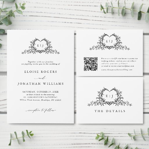 This elegant wedding invitation features refined calligraphy and classic typography in a simple, chic layout with a delicate botanical monogram crest. The clean black and white design creates a timeless and modern look, perfect for formal, rustic, or minimalist weddings. The reverse side includes space for additional wedding information such as reception details, directions, accommodations, or RSVP instructions, making it both stylish and practical. Ideal for couples who love sophisticated, understated stationery with a modern yet classic feel.