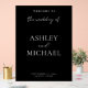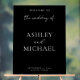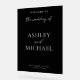 Create your own acrylic wedding sign featuring custom names, date and other wedding details in white modern minimalist typography on black background. A sleek and minimalist way to greet guests on your special day.