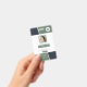 Professional identification card with photo, logo, barcode, and qr code templates included. This modern design style has shades of muted green and black with white base. Similar design on back, with business address, website address, and a website qr code.