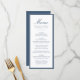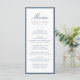 This wedding menu showcases “Menu” in flowing navy blue calligraphy, paired with classic serif typography for the couple’s names, wedding date, and meal selections. The rich navy border adds depth and contrast, giving the card a tailored, refined look that works beautifully for formal, coastal, and evening celebrations. The clean vertical layout highlights each course with clarity while maintaining an elegant, timeless feel that coordinates seamlessly with sophisticated wedding table settings.