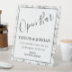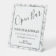 Add a sophisticated yet playful element to your reception decor with this Modern Open Bar Wedding Sign. Perfectly coordinated with the "Taylor & Jordan" suite, this sign features a clean, high-contrast design framed by a bold black border and elegant black and white botanical line art.