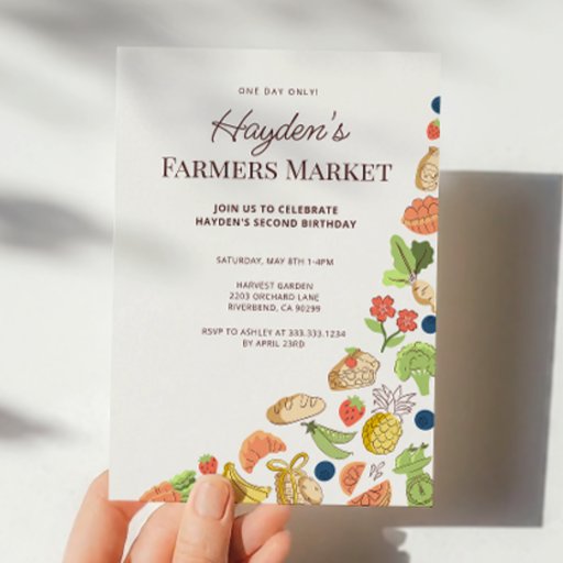 Bring fresh charm to your celebration with this modern farmers market invitation featuring colorful hand-drawn fruits, vegetables, and greenery. Perfect for a birthday party, baby shower, or garden party, this organic and gender neutral design captures the feel of a locally grown and country inspired event. A sweet choice for anyone who loves farm fresh style and simple, natural details.