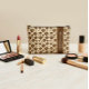 A refined geometric pattern featuring brown and white squares, diamonds, and hexagons on a warm beige background.