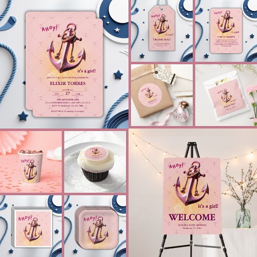 Modern Pink Ahoy! Anchor Nautical Baby ShowerDesignt von Elixir Torres