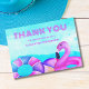 Niedliches, modernes rosa Flamingo Geburtstagsschwimmbad Party Dankeschön Karte. Trendy, lebendiges Aquarelldesign für das sommerliche Party. Einfach den Text ändern.