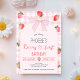 Berry first birthday invitation template for girl featuring various strawberries and white daisies on a pink gingham pattern background and arch. This berry first birthday invitation also features a pink bow, heart font heading and is ideal for a girls berry themed first birthday party.