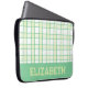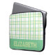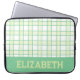 A modern preppy plaid laptop sleeve in pastel green and lime, designed with a varsity-style custom name lettering near the bottom edge, giving it an academic vibe. Slip your laptop inside for classes, library study sessions or trips across campus - the protective build and stylish cover make it both practical and pretty. Add your name to make it feel distinctly yours. Thanks for viewing an Eria Daisy Art design!
