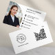 Modern Professional Photo QR Code Social Media white business card with minimalist contemporary style, photo template on the front, and the company logo on the back, with QR code for website and social media connection.